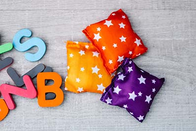 ABC magnets, hacky sacs, a bag, and something to throw them in (box)