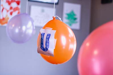 Write letters on balloons, hang them, and have your child identify each letter and its sound.