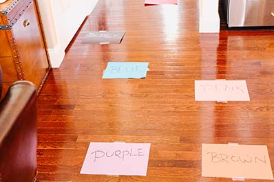 Label papers by color, tape them on the floor, and have your child hop or crawl to called colors to reinforce learning and movement.